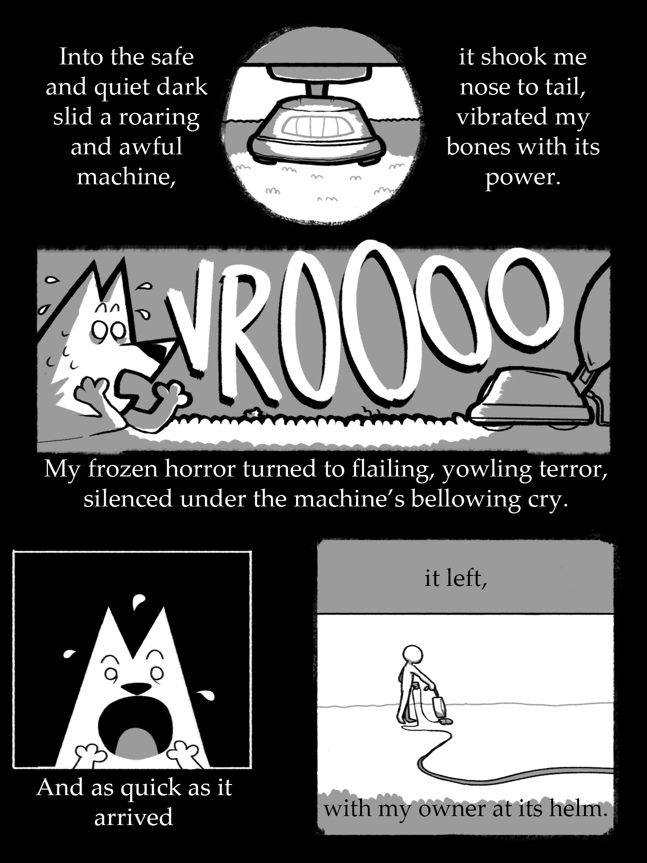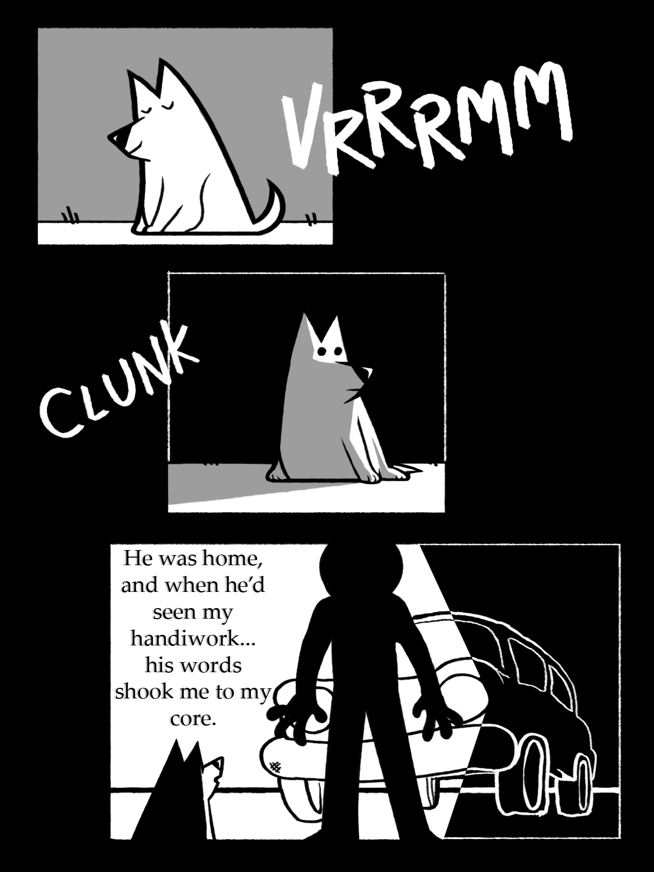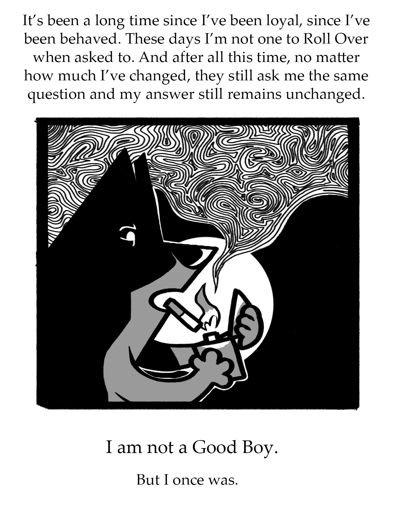 A selection of pages from Bad Dog, an improvisational grayscale book/comic that I drew over the course of October 2016 as part of an "Inktober" challenge.